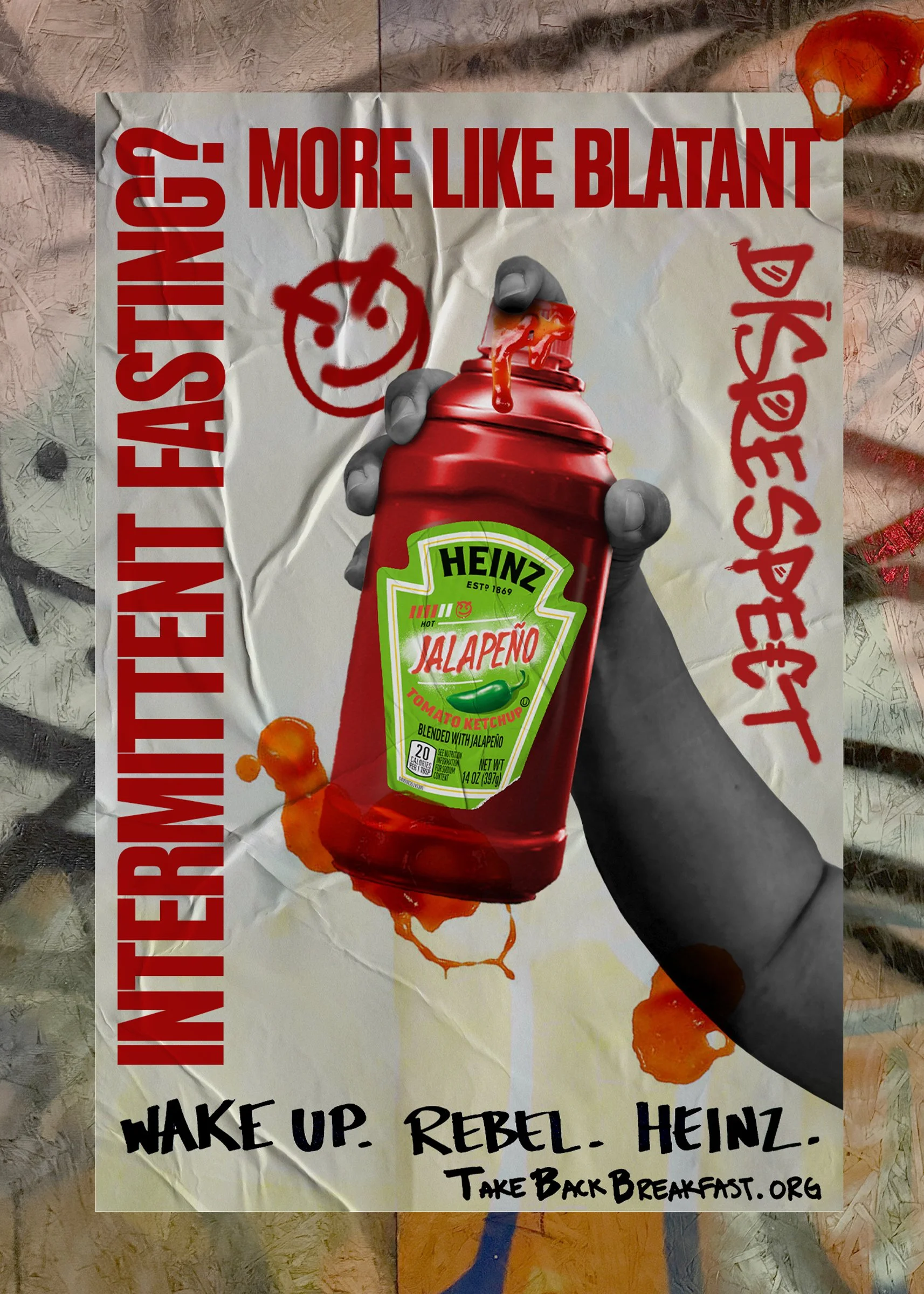 Breakfast has taken a backseat for too long. The “most important meal of the day” has been sidelined. Limited to “only served until 10 a.m.,” reduced to a sad, boring granola bar, or worst of all, skipped. At Heinz, we're tired of seeing breakfast mistreated. We're frustrated. Fired up. Spicy, even. As the #1 ketchup brand in the U.S., we’ve decided to use our platform to call attention to this culinary disrespect. Heinz Jalapeño Ketchup fights to revive breakfast. Stand up and join the rebellion.